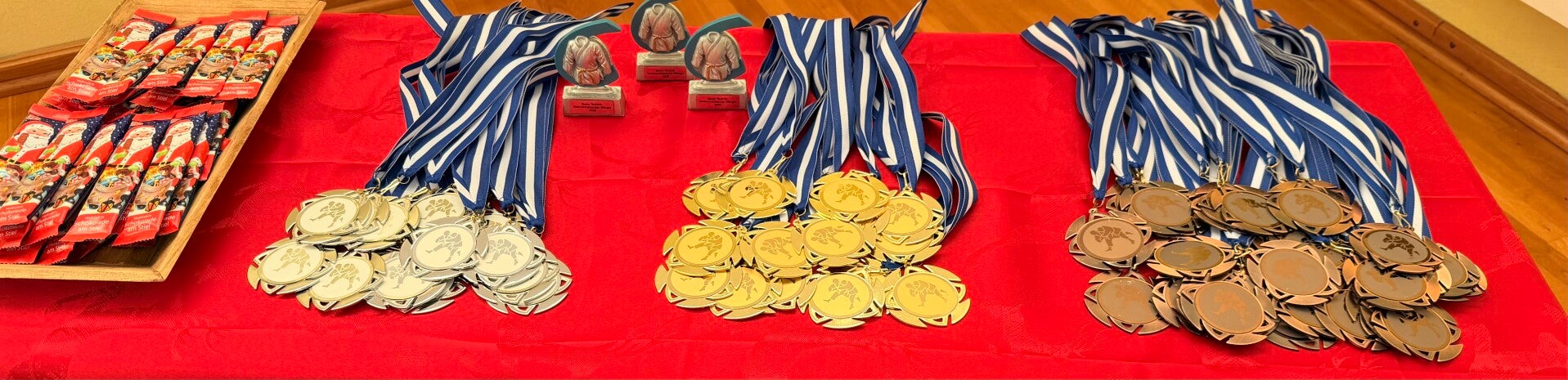 Die Siegerehrung konnte in diesen Jahr auf einem Siegerpodest durchgeführt werden, das eigens für den Verein gebaut wurde. Passend zu den Vereinsfarben strahlt nun ein weißes Stockerl mit blauen Häubchen auf den Turnieren des Judo Team Wängle.